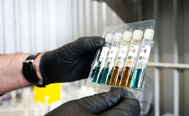 Insamlat vatten genomgår noggrann analys. Testresultaten visar att renat vatten från anläggningen underskrider fastställda utsläppsgränser med god marginal.